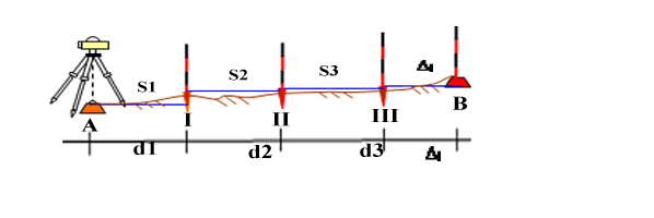 Để dóng hướng, máy kinh vĩ sẽ được định tâm và cân bằng tại A, tiến hành ngắm chuẩn tiêu ngắm đặt tại B và hãm ngang; dùng mặt phẳng ngắm chuẩn này để điều chỉnh các đầu cọc I, II, III trùng tim tuyến AB ( hình 4.4).