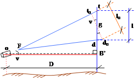 Trong đó: d - khoảng cách từ trục quay của máy kinh vĩ tới quang tâm kính vật; fv - tiêu cự kính vật. Hai thông số này trong chế tạo đã biết và đặt c = d + fv gọi là hằng số cộng của máy. Còn đại lượng D' tính bởi công thức: |